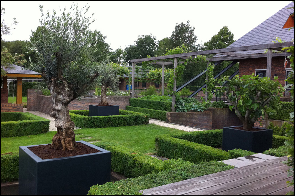 A run of 100cm x 100cm x 95cm ADEZZ Hardwood Valencia Square Planters planted with specimen Olive trees (pictured below)..