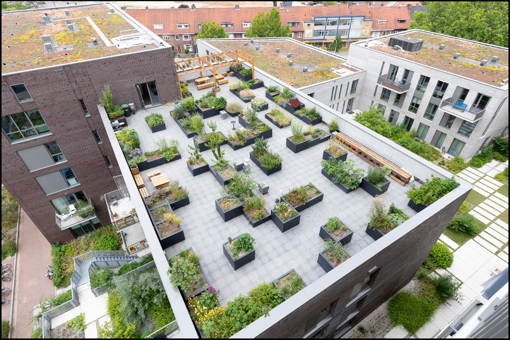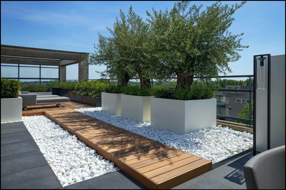 ADEZZ Fibreglass Planters enhance the ground-level landscape but are also perfect for landscaping at height. Lightweight and durable, the extensive range is ideal for screening and dividing roof terraces with less risk of over-loading where weight restrictions are in place. Some 50 fibreglass planters in RAL 7021 Black Grey cleverly positioned on the large roof garden at Space-S residential apartments in Eindhoven, Holland (pictured above). In addition, a run of 3 CARREZ Low Square Planters in RAL9016 Traffic White planted with mature Olive Trees affords some privacy and adds interest to this Dutch penthouse (pictured below).