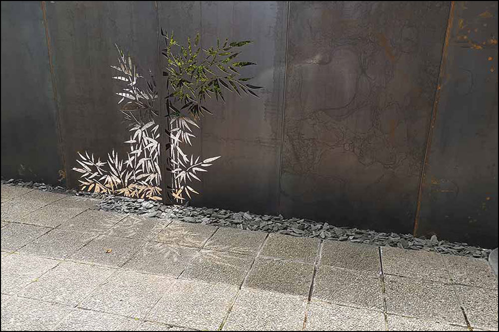 Corten Steel Panels are an alternative to traditional fencing. Sandwiching Cluster and Verticle Bamboo Panels with Basic Panels (pictured above) Les Beaux Jardins have executed an eye-catching run to the highest standards. The Corten Steel Panels, shown in a blue-like state, are just starting the weathering process.