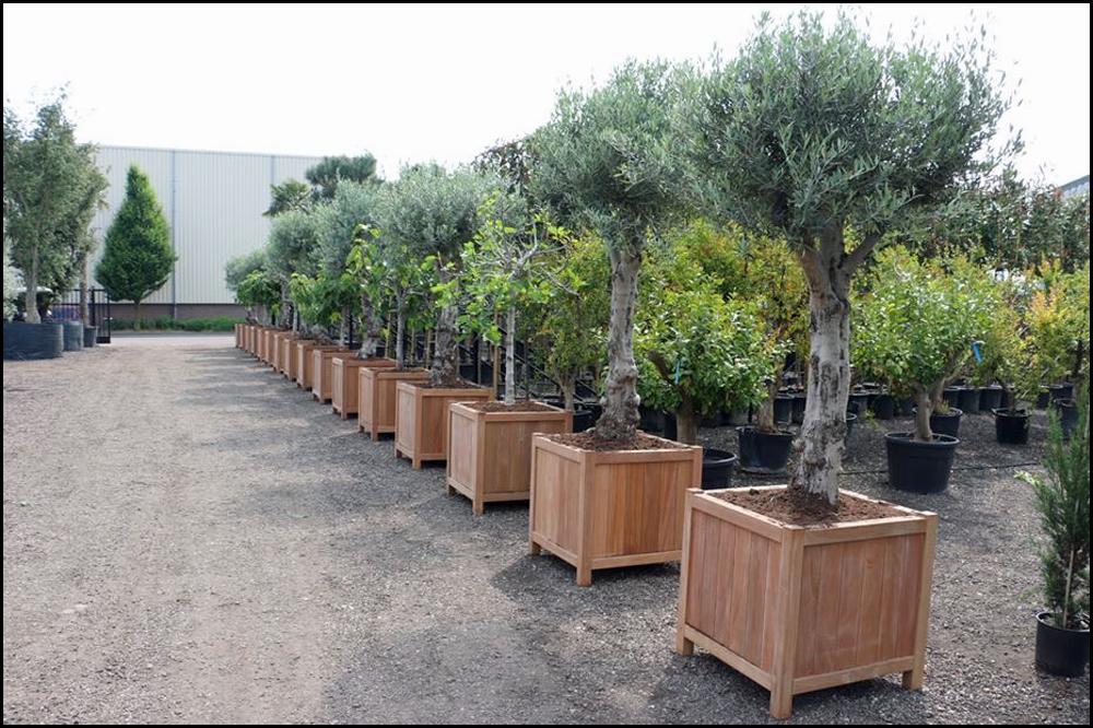A run of 100cm x 100cm x 95cm ADEZZ Hardwood Valencia Square Planters planted with specimen Olive trees (pictured below)..