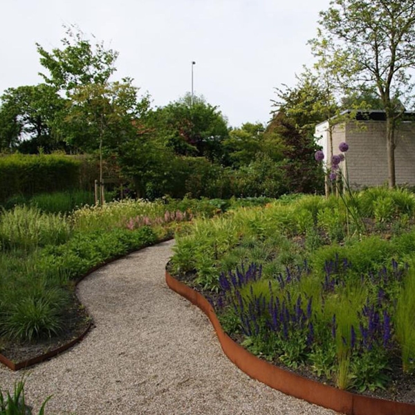 The installation of ADEZZ Corten Steel Edging, fabricated from 2/3mm metal thickness to lawns, borders, driveways, and even roofs, may well be one of the finishing touches to garden design but certainly one of the most satisfying applications.