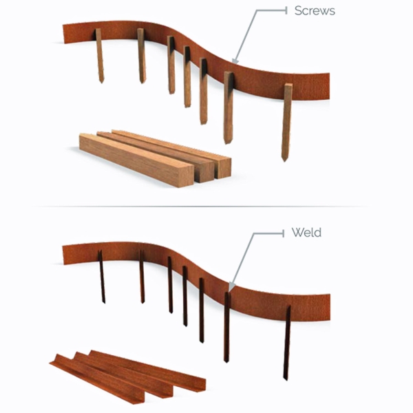 It is best to secure Corten Steel Edging to anchoring points for a successful installation. Anchoring points like Hardwood Pegs or Corten Steel Pegs are driven or concreted into the ground and screwed or spot welded in place.
