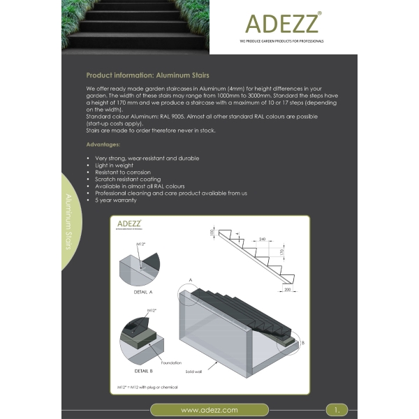 Aluminium is a weatherproof and durable material, and the stairs look stylish and timeless; Aluminium is low maintenance. All ADEZZ Aluminium Stairs sold with a 5-year warranty.