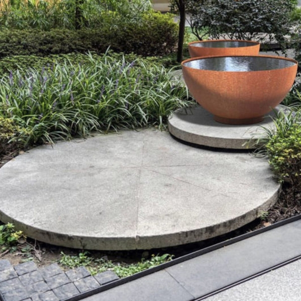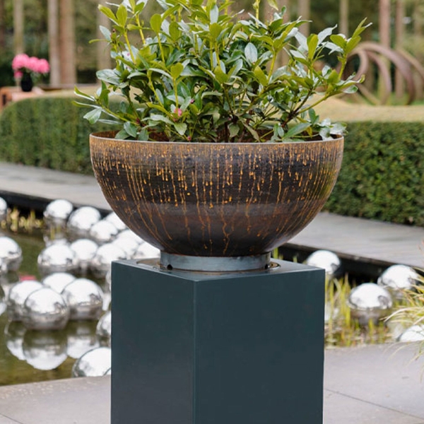 The 'Bocca' is a slightly taller, bowl-shaped freestanding water feature fabricated from 4mm Corten Steel. Stand-alone, elevate on a plinth or stagger in different sizes to create an eye-catching display.