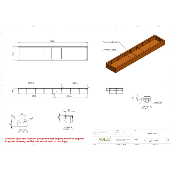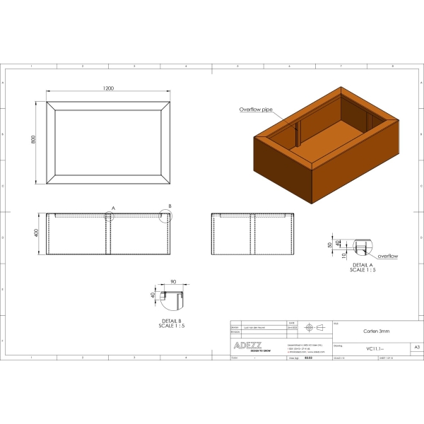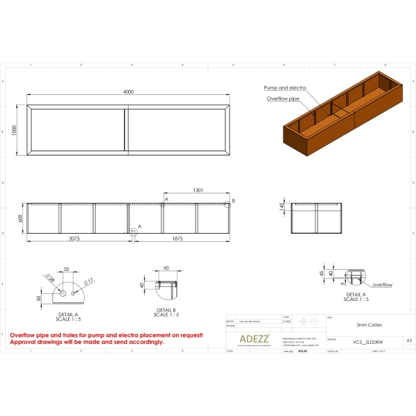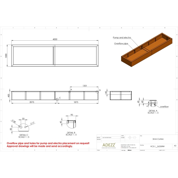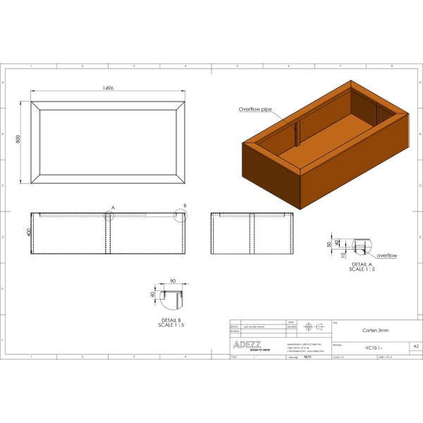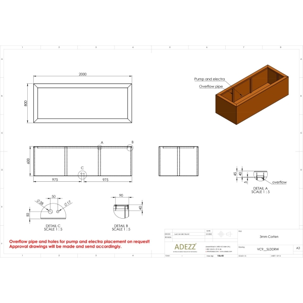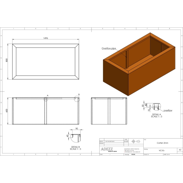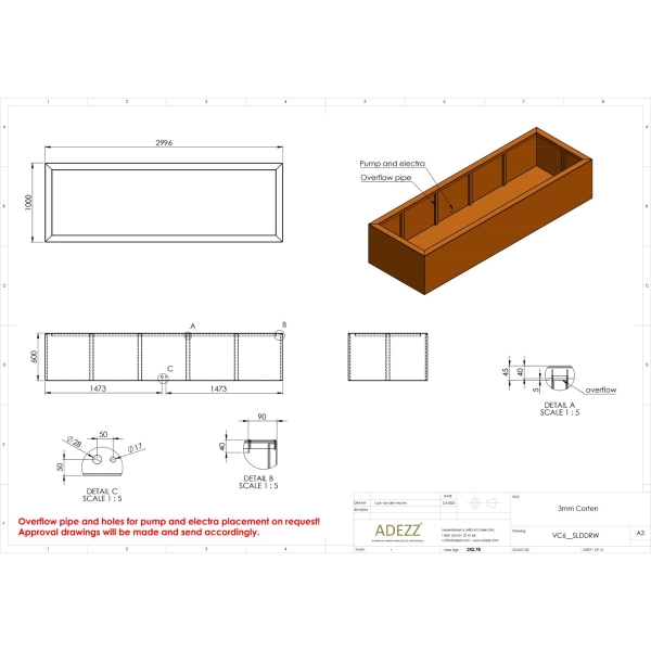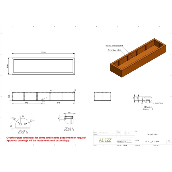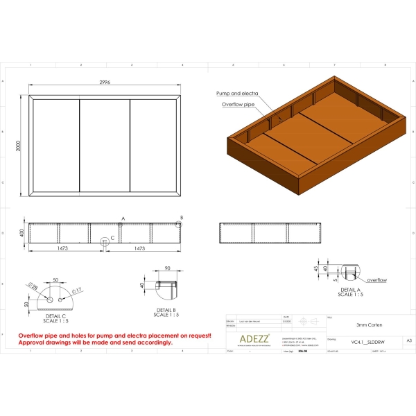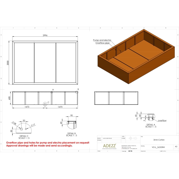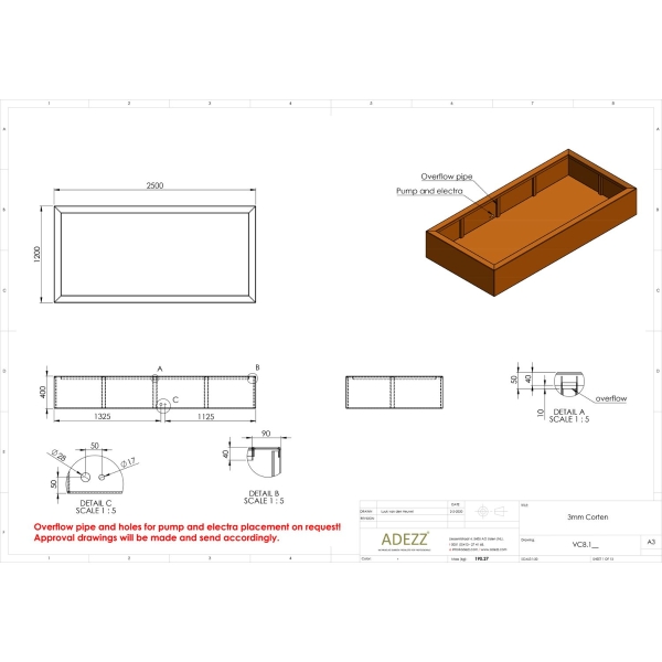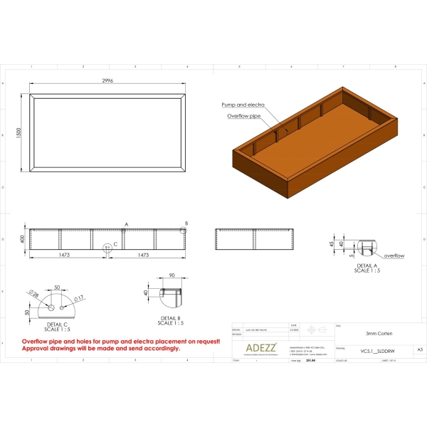 Click here to download the ADEZZ Corten Pond Information SheetThe pond is supplied with or without an optional water and power inlet on the short or the long side.