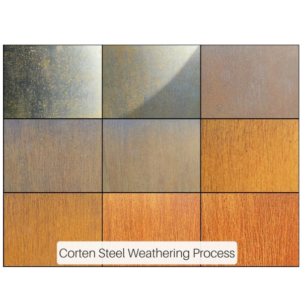 The ADEZZ Corten Steel Pond will arrive un-rusted (blue steel) or part rusted. Once exposed to the elements the Corten Steel will naturally weather, this is known as the 'weathering process' (see image). Throughout the weathering process, please be aware that there will be 'run-off' from the Corten Steel that can cause staining.