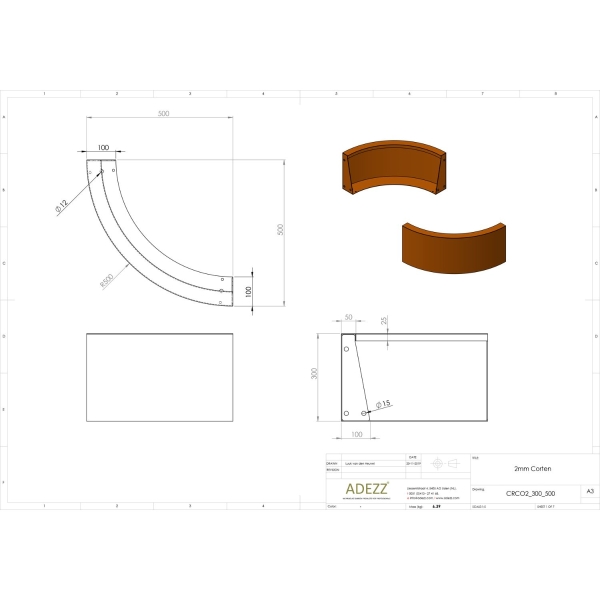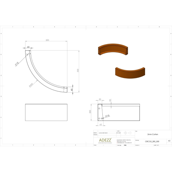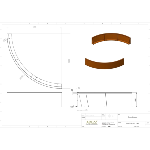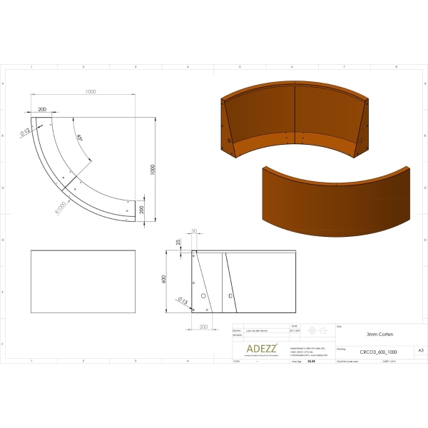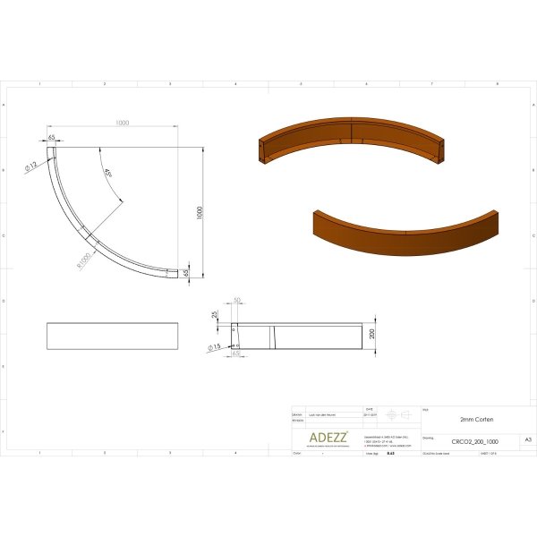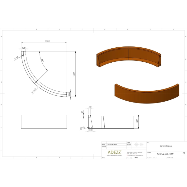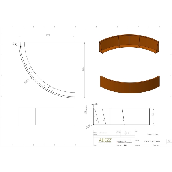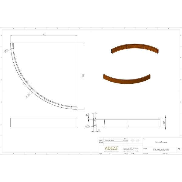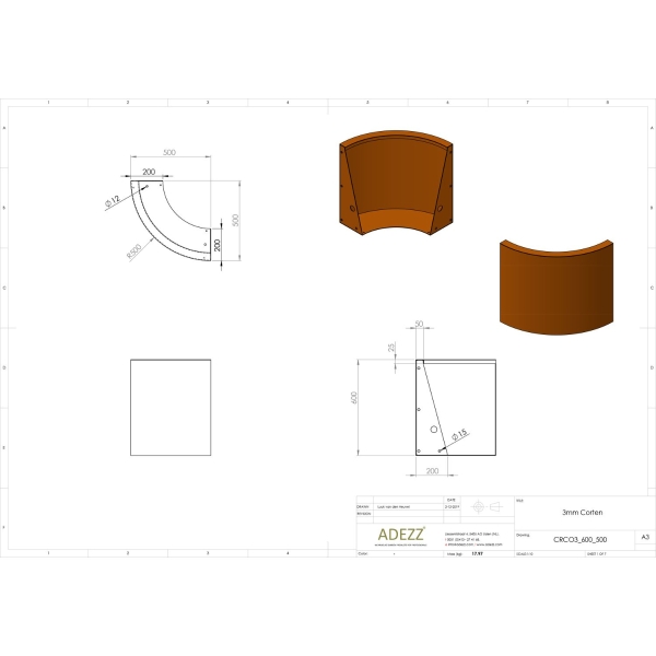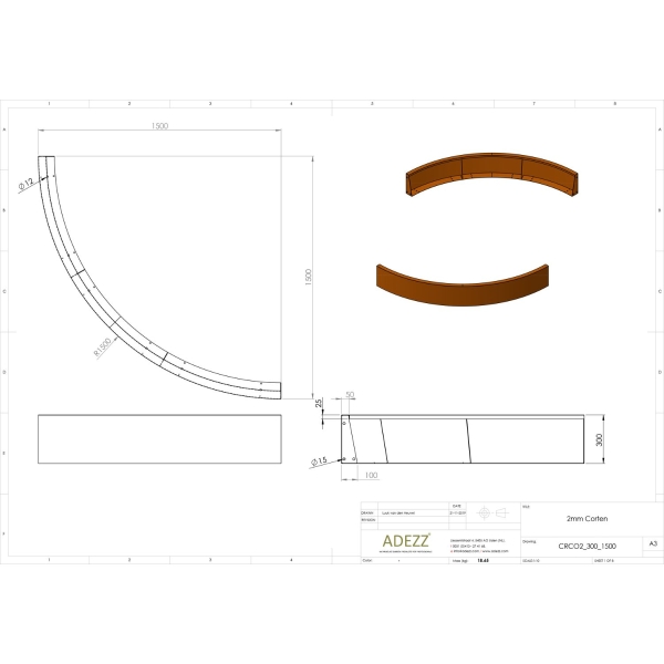 ADEZZ Retaining Walls have a top edge of 50mmx25mm as standard. All 'Outside Radius' Corten Steel Garden Walls are offered in 50cmx50cm, 100cmx100cm, 150cmx150cm and 200cmx200cm Lengths and measure 20cm, 30cm, 40cm and 60cm high. Fasteners, supplied, make the prefab system easy to install using straight, straight corner and radius corner fabrications.