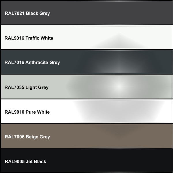 The standard recommended colour is RAL9016 Traffic White. RAL7021 Black Grey, RAL7016 Anthracite Grey, RAL7035 Light Grey, RAL9010 Pure White, RAL7006 Beige Grey and RAL9005 Jet Black are also available to order online with no minimum order and a surcharge of 10%. Any other RAL colour is possible with a minimum order of 20 units and a surcharge of 25%. Please contact Riverhill Garden Supplies to discuss your requirements. (Please note that a longer lead time will apply for non-standard colours).