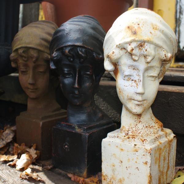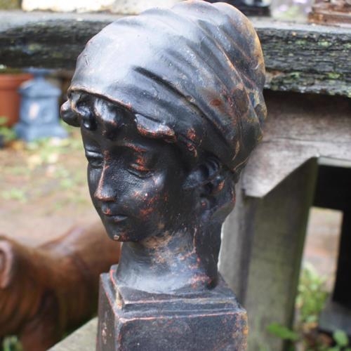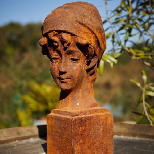 The Cast Iron Classic Girl Portrait Statue's elegant profile makes a striking decorative accent for the home or Garden. It is available in natural rust, bronze, and antique white finishes.