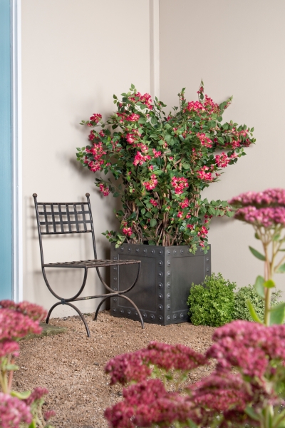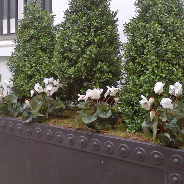 Optional drainage holes allow both indoor and outdoor use. For best results keep the planting scheme simple, the rivets are the focal point here. Specimen trees softened with lilac, and white flowering annuals work well, as do ornamental grasses like Festuca glauca Blaufuchs.